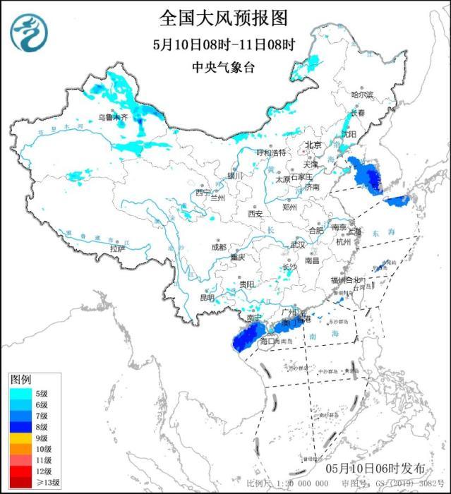 5月10日08时至11日08时,新疆北疆山区和北疆东部、辽宁中部和辽东半岛、山东半岛东部、湖南南部、广西中北部等地部分地区有平均风5~6级、阵风7~8级,黄海大部海域、东海东北部海域、北部湾、琼州海峡、南海西北部海域将有7~8级、阵风9级的大风。中央气象台5月10日06时继续发布大风蓝色预警。