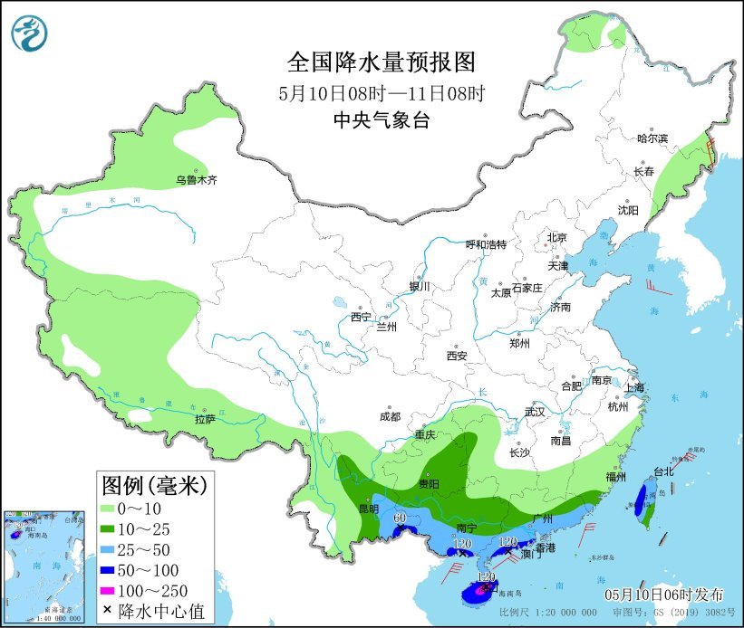 5月10日08时至11日08时,云南东部、贵州东部和南部、广西西部和中南部、广东中南部等地部分地区有中到大雨,其中,云南东南部、广西西南部和东南部沿海、广东西南部沿海、海南岛大部、台湾岛中部等地部分地区有暴雨,局地大暴雨(100~120毫米)。新疆北疆山区和北疆东部、辽宁中部和辽东半岛、山东半岛东部、湖南南部、广西中北部等地部分地区有平均风5~6级、阵风7~8级。