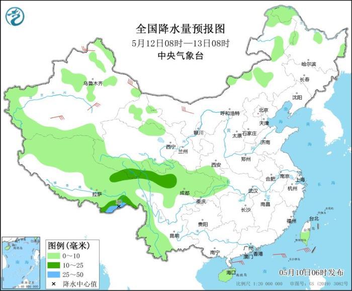 5月12日08时至13日08时,内蒙古东北部、黑龙江西北部、新疆南部、西藏大部、青海南部、西南地区北部、海南岛、台湾岛等地部分地区有小到中雨,其中,西藏南部等地部分地区有大雨(25~30毫米)。内蒙古西北部、新疆北疆等地部分地区有4~6级风,阵风7~8级。